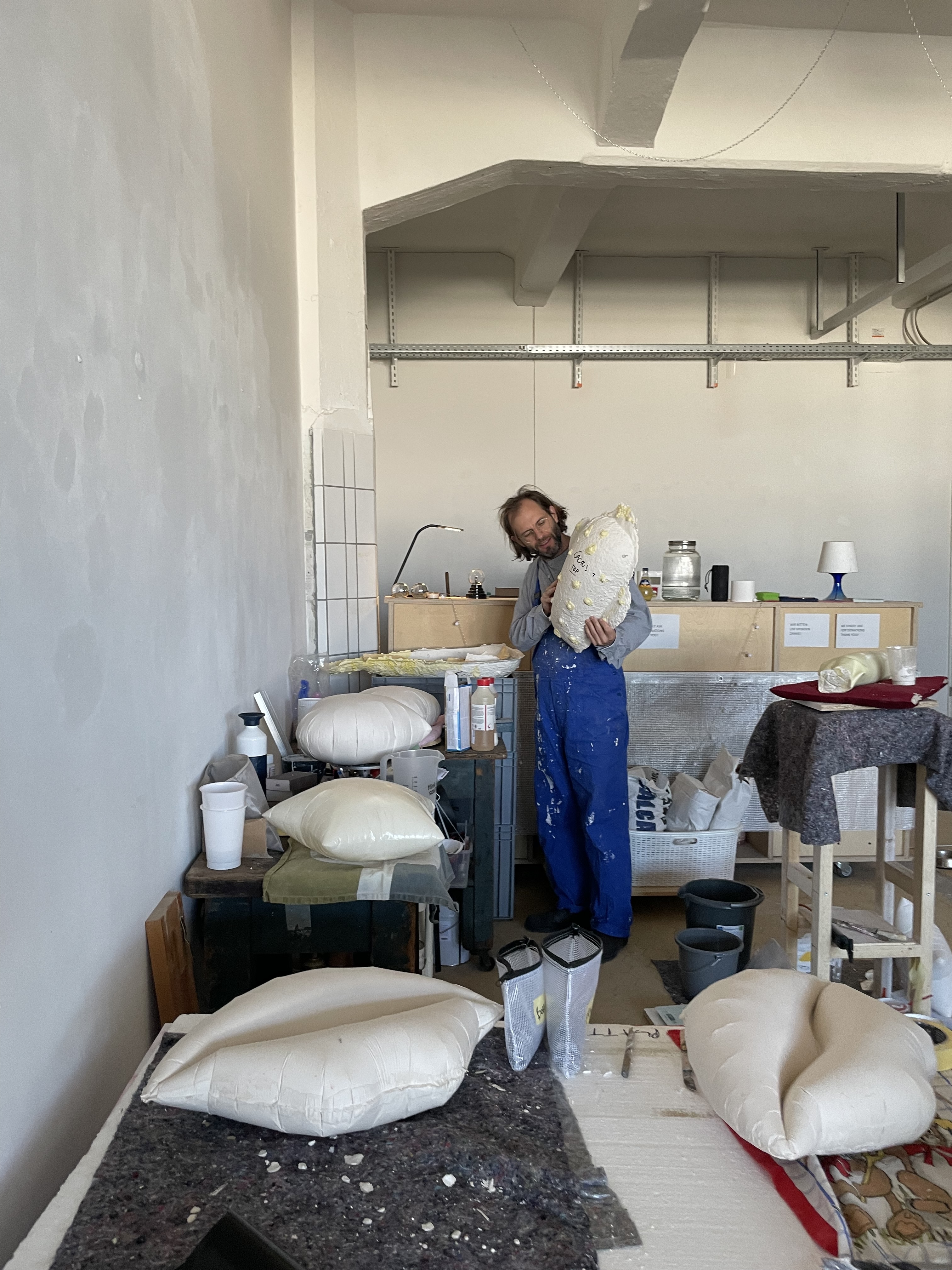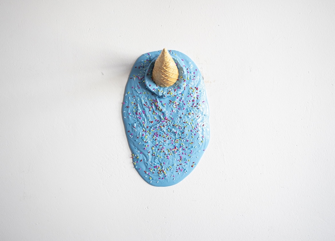 Staffas Serie der Eiscreme-Skulpturen begann aus einem einfachen Impuls der Freude. „Ich wollte etwas machen, das sich leicht anfühlt und nicht dystopisch“, erzählt er. Die Idee entstand aus Fotos, die er gemeinsam mit einer Freundin von heruntergefallenen Eiswaffeln in Neukölln machte. Diese zufälligen Alltagsmomente wurden zur Grundlage für verspielte Gipsobjekte, die die übersehene Schönheit des Alltäglichen feiern.